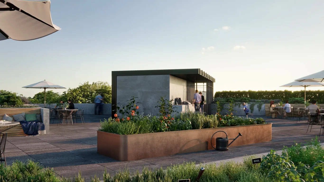 — Landscaped rooftop with vegetable and herb gardens, BBQ facilities, casual dining areas and breathtaking views.