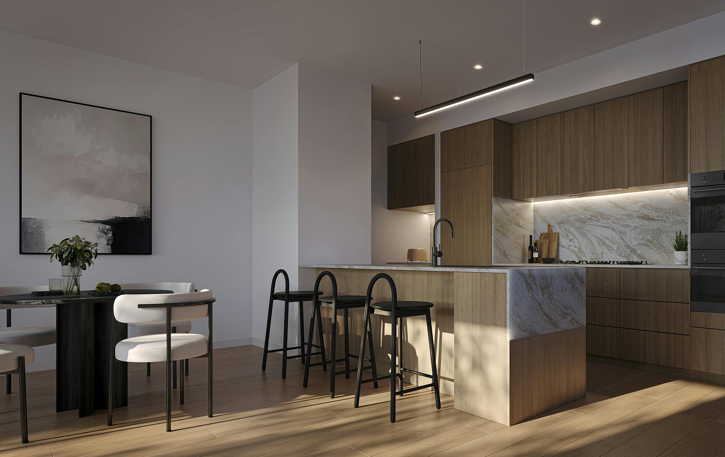 This limited collection is future-proofed with private lifts to each home and well zoned with expansive primary suites with walk-in-robes and baths, light-filled living spaces, multiple balconies, and a timeless material palette.