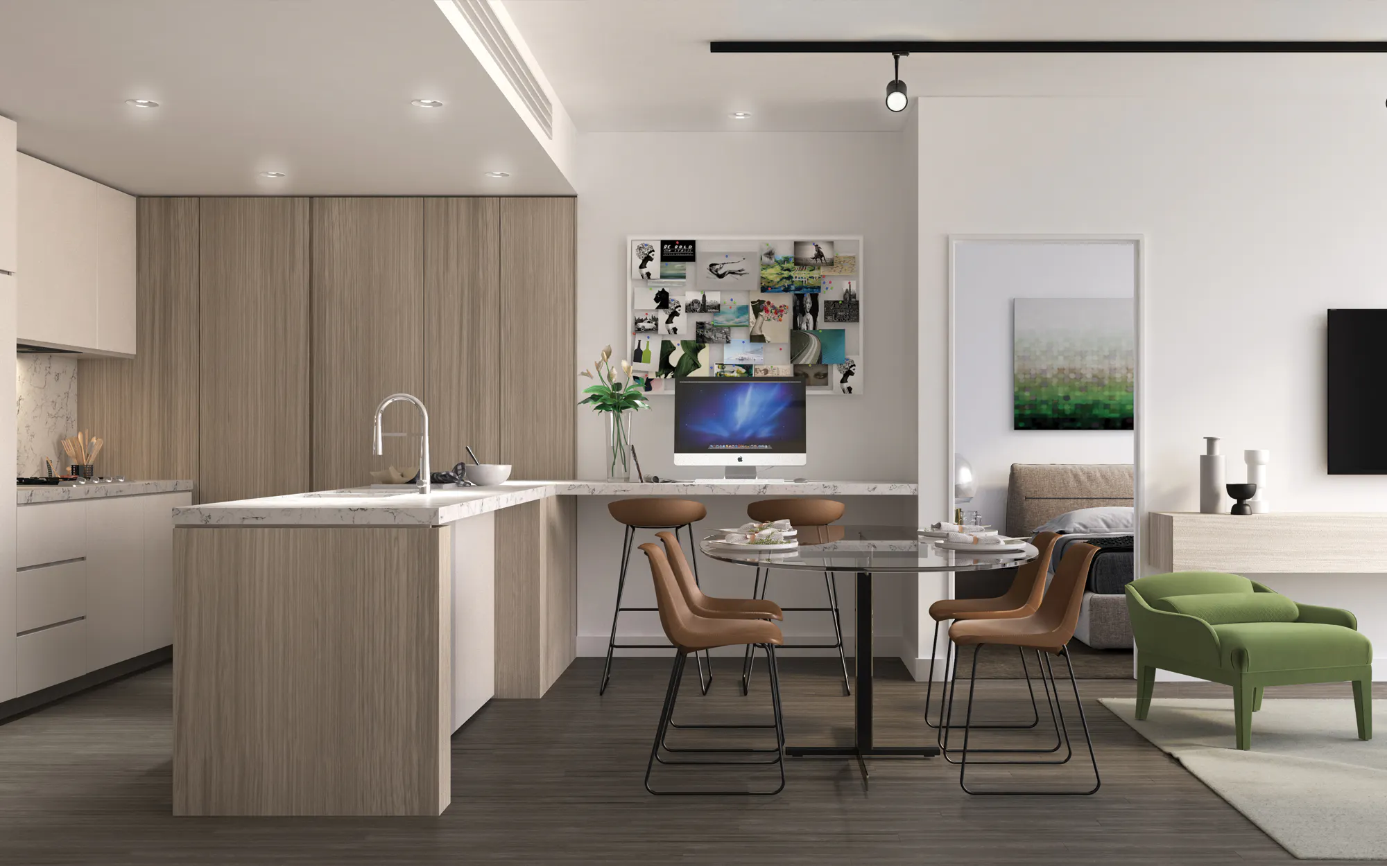 These sleek apartments provide a beautiful combination of natural finishes, from stone benchtops to timber floors. Large windows and generous balcony spaces open to spectacular views, creating a constant connection to the nearby parkland. High ceilings, smart-wired lighting and European appliances add an additional layer of luxury.
